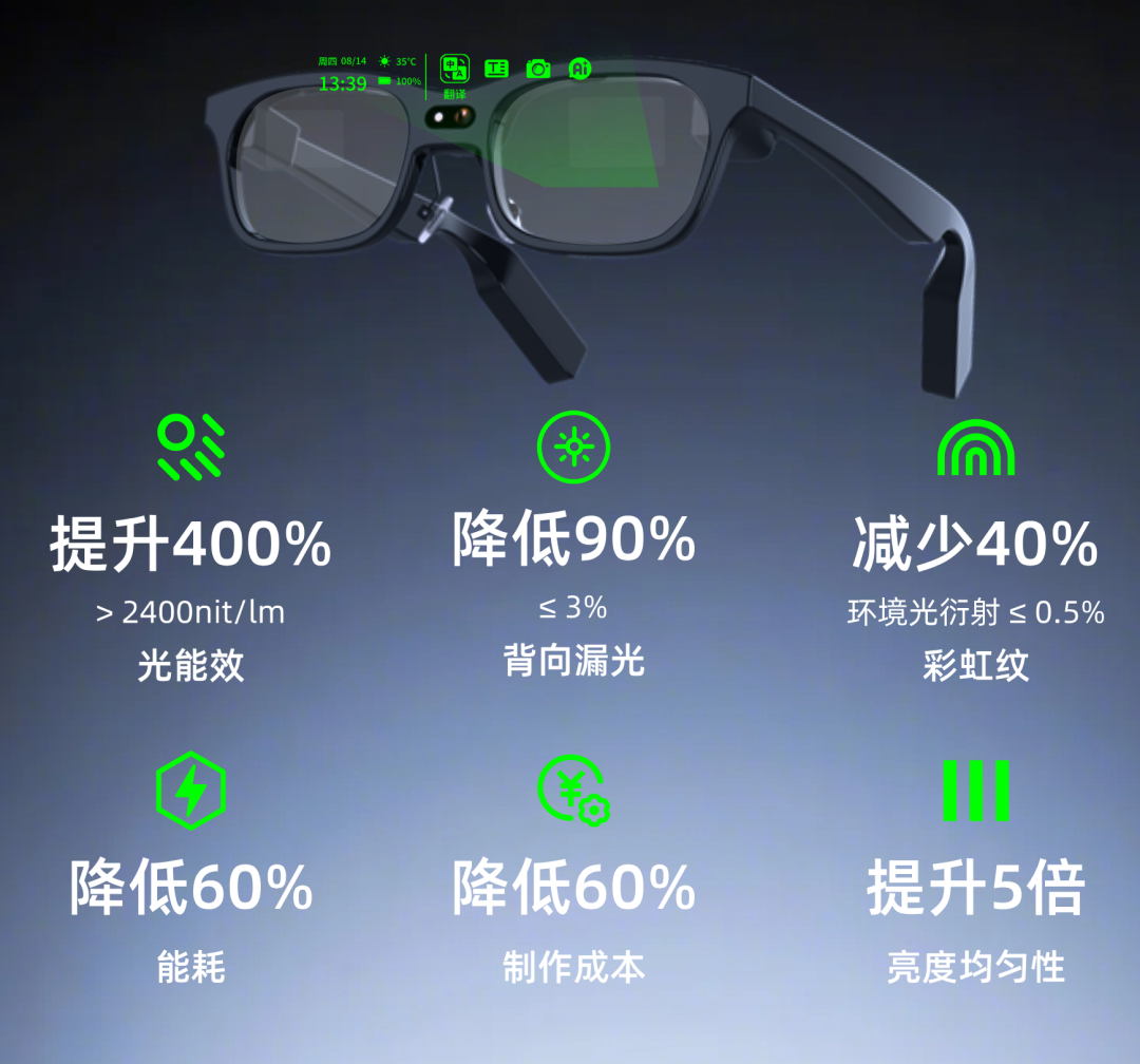 为户外场景量身打造,追求极致亮度与续航表现。立讯精密和东南大学、南京平行视界技术有限公司联合推出的PVG单绿AR眼镜,展现了在光学技术上的一种极致探索。