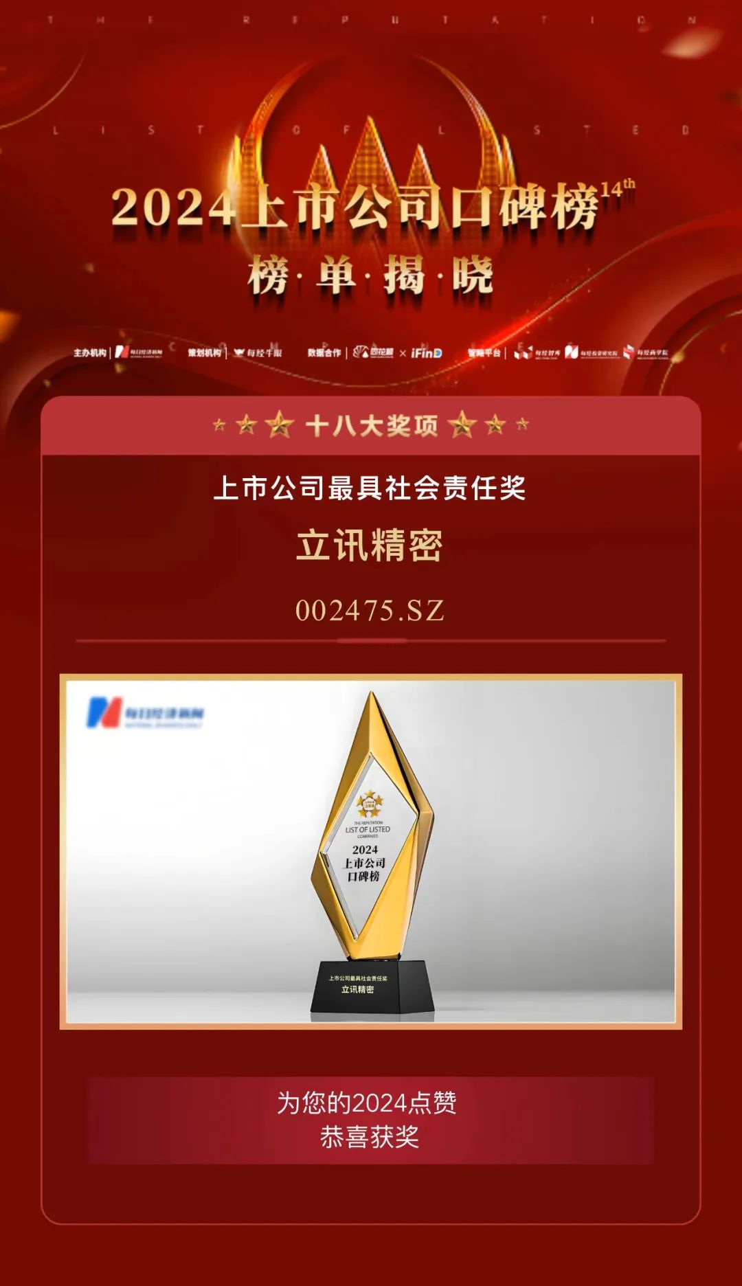 12月6日,每日经济半岛(中国)隆重揭榜“2024第十四届中国上市公司口碑榜”。立讯精密成功入围榜单并获“上市公司20年非凡跨越奖”和“上市公司最具社会责任奖”两大权威奖项。