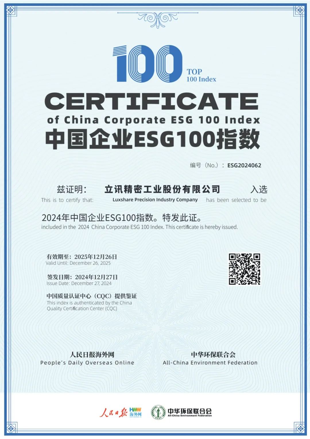 近日,由人民日报海外网与中华环保联合会联合举办的“第二届新时代中国品牌形象海外传播论坛暨2024中国企业ESG蓝皮书发布会”在京召开。为讲好中国品牌与中国企业ESG故事,推动中国企业品牌形象海外传播,大会征集多份ESG杰出案例后纳入《企业ESG蓝皮书:中国企业环境、社会与治理报告(2024)》,并专设“2024中国企业ESG100指数”以对优秀案例进行表彰。立讯精密凭借在可持续发展领域的卓越表现,成功入选“2024中国企业ESG100指数”,充分彰显了公司“将ESG落地生根,引可持续发展枝繁叶茂”的决心和实力。