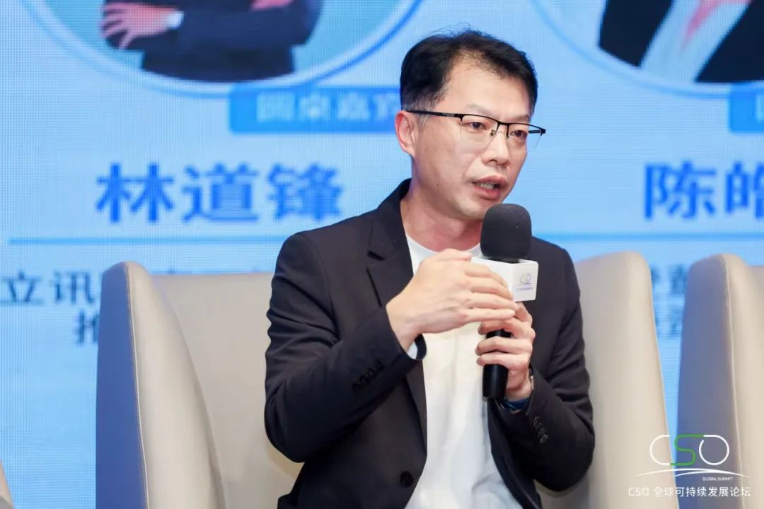 作为行业代表,立讯精密可持续发展推进中心林道锋总监受邀出席论坛,参与以“多重压力下的供应链绿色转型”为主题的ESG圆桌讨论,分享了公司在推进绿色转型方面的的实践经验和深刻洞见。